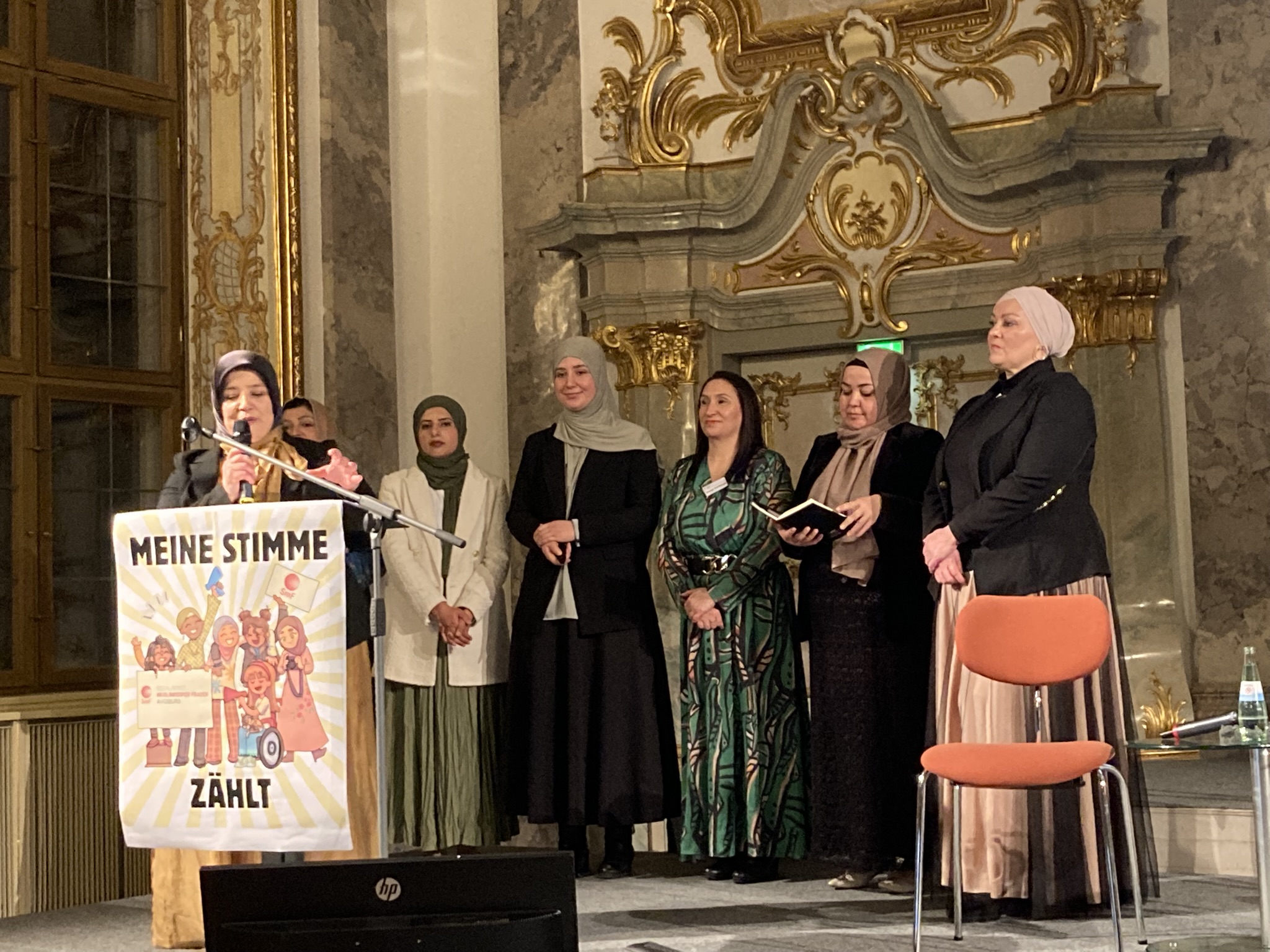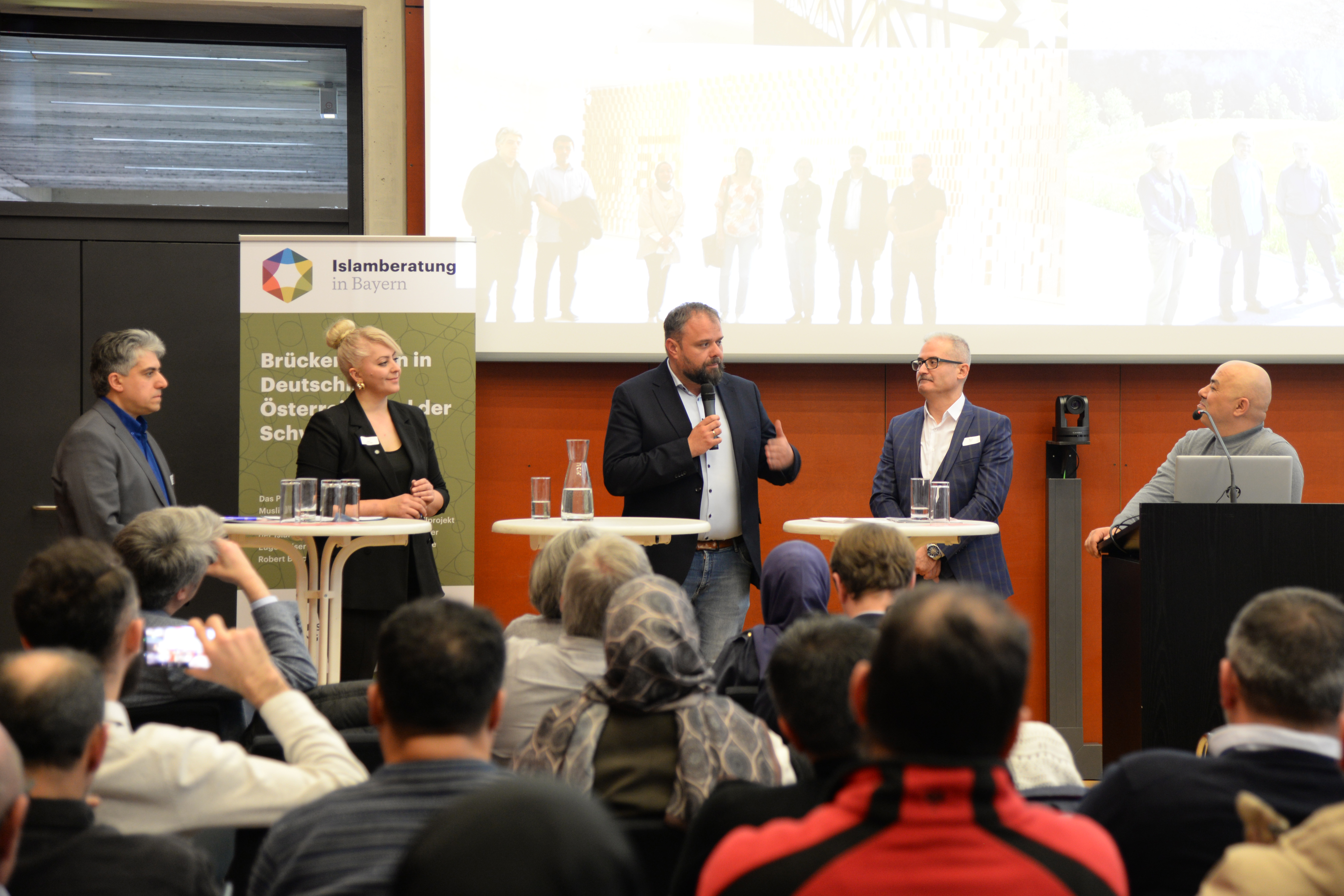 Ein Höhepunkt war die Präsentation des im Juli 2025 gegründeten SmF Augsburg, der nicht nur die eigene vielfältige Arbeit vorstellte, sondern anhand persönlicher Geschichten auch aufzeigte, welche Beiträge die oft übersehenen muslimischen Frauen für die Gesellschaft leisten. Darum ging es anschließend auch bei der von Dr. Margret Spohn, Leiterin des Büros für gesellschaftliche Integration der Stadt Augsburg, moderierten Podiumsdiskussion. Martina Wild, Bürgermeisterin und Referentin für Bildung und Migration der Stadt Augsburg, berichtete über ihre Erfahrungen aus Augsburg, während, Ayten Kiliçarslan, geschäftsführende Vorsitzende des SmF-Bundesverbands, ihren Blick auf verschiedenen SmF-Standorte in Deutschland einbrachte. Ebenfalls auf dem Podium vertreten waren Prof. Dr. Elisabeth Naurath, Professorin für Religionspädagogik und Didaktik des Religionsunterrichts an der Universität Augsburg und Dr. Hussein Hamdan, der seine Erfahrungen mit dem Vorhaben in Augsburg in den Kontext der Islamberatung im DACH-Raum stellte.