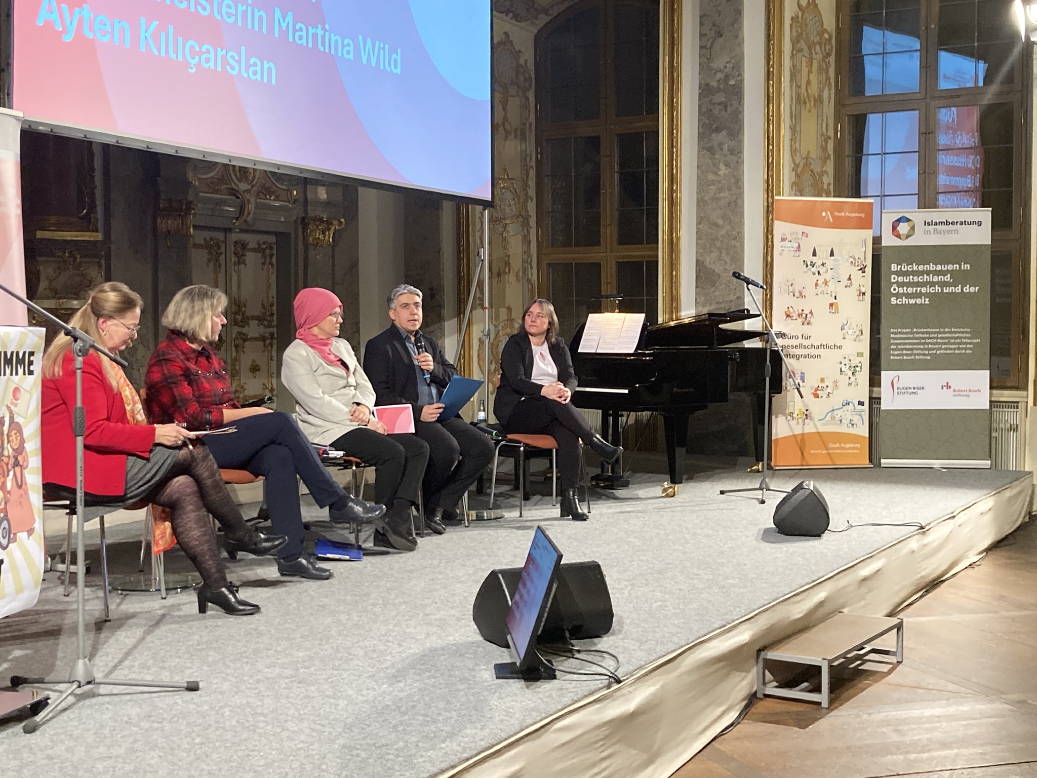 Ein Höhepunkt war die Präsentation des im Juli 2025 gegründeten SmF Augsburg, der nicht nur die eigene vielfältige Arbeit vorstellte, sondern anhand persönlicher Geschichten auch aufzeigte, welche Beiträge die oft übersehenen muslimischen Frauen für die Gesellschaft leisten. Darum ging es anschließend auch bei der von Dr. Margret Spohn, Leiterin des Büros für gesellschaftliche Integration der Stadt Augsburg, moderierten Podiumsdiskussion. Martina Wild, Bürgermeisterin und Referentin für Bildung und Migration der Stadt Augsburg, berichtete über ihre Erfahrungen aus Augsburg, während, Ayten Kiliçarslan, geschäftsführende Vorsitzende des SmF-Bundesverbands, ihren Blick auf verschiedenen SmF-Standorte in Deutschland einbrachte. Ebenfalls auf dem Podium vertreten waren Prof. Dr. Elisabeth Naurath, Professorin für Religionspädagogik und Didaktik des Religionsunterrichts an der Universität Augsburg und Dr. Hussein Hamdan, der seine Erfahrungen mit dem Vorhaben in Augsburg in den Kontext der Islamberatung im DACH-Raum stellte.