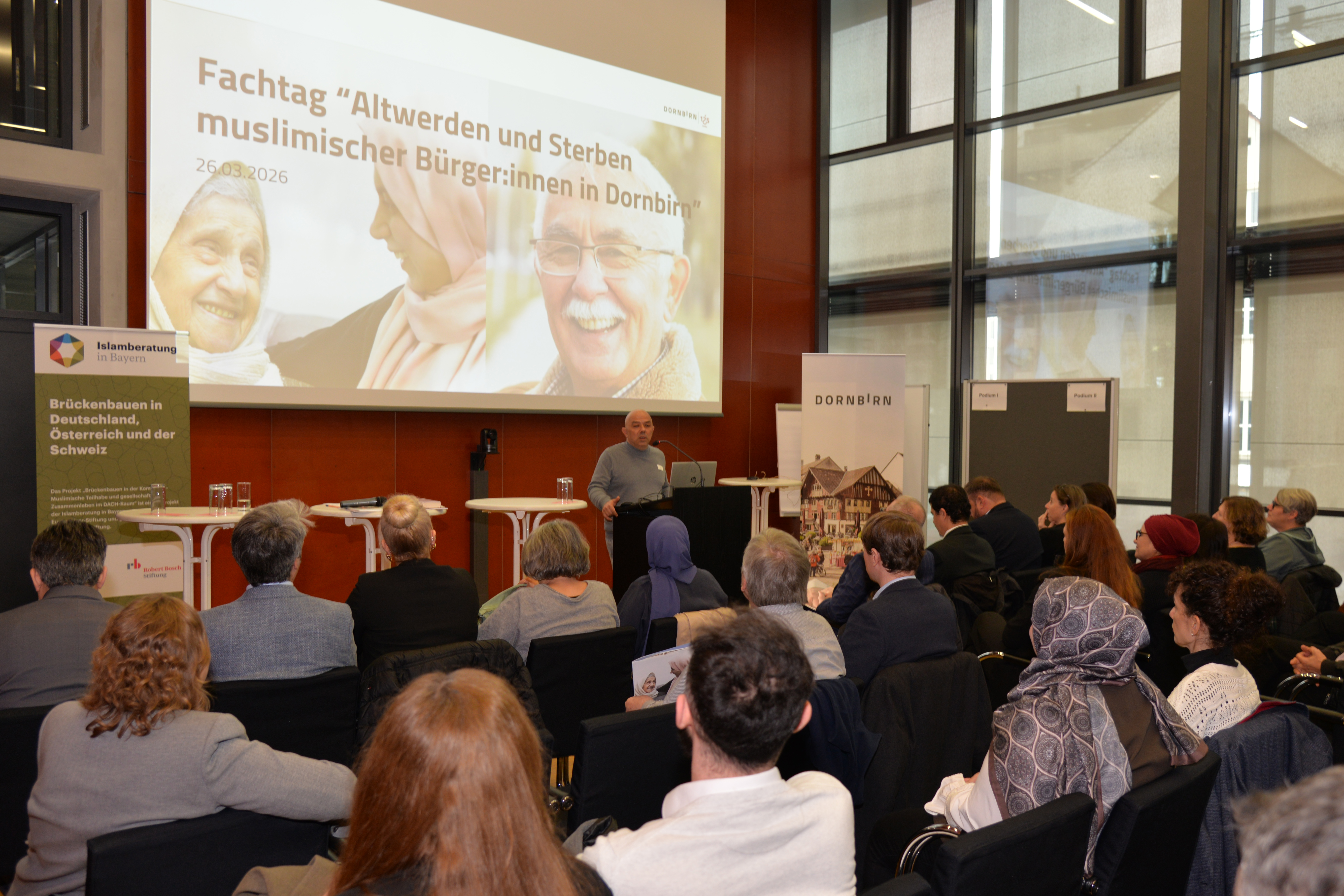 Durch den gesamten Nachmittag führte Fatih Özçelik als Moderator. Für die Eugen-Biser-Stiftung war Stefan Zinsmeister nach Dornbirn gereist. In seinem Grußwort hob er die Bedetung des Themas Altwerden und Sterben muslimischer Menschen als Zukunftsthema hervor.